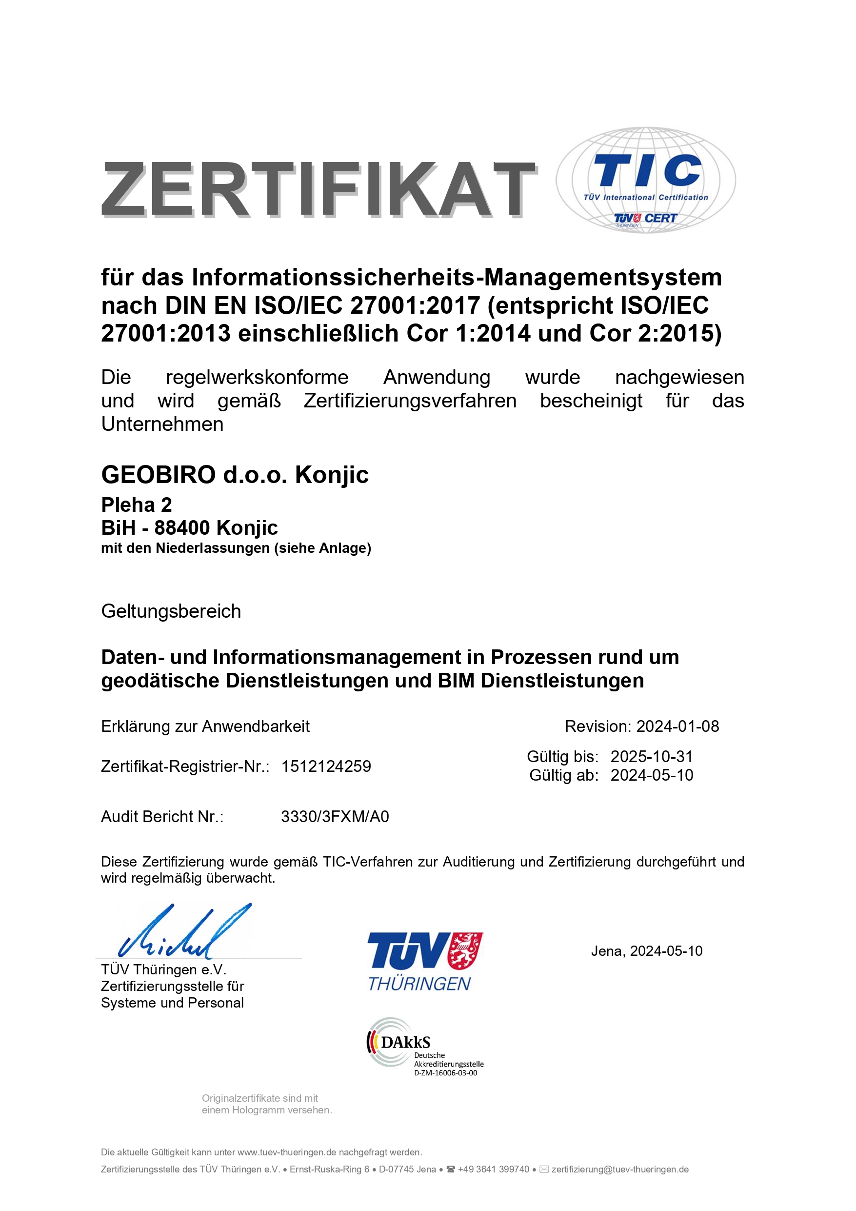 Neben den Bedingungen, die wir zur Zertifizierung für geodätische Arbeiten erfüllt haben, verfügen wir über geeignete technische Mittel und Geräte, um geodätische Arbeiten durchzuführen. Die Zertifizierung ist von unabhängigen geodätischen Geschäftsleuten durchgeführt worden. Das Zertifikat ist von der Federal-Geodätischen Verwaltung ausgestellt.